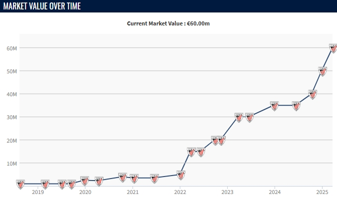 桑謝特在場(chǎng)上司職進(jìn)攻型中場(chǎng),2015年加入畢爾巴鄂青訓(xùn),2020年正式進(jìn)入一線隊(duì)。近年來桑謝特的身價(jià)一直穩(wěn)步上升,過去半年他的身價(jià)已經(jīng)連續(xù)兩次上漲1000萬歐。