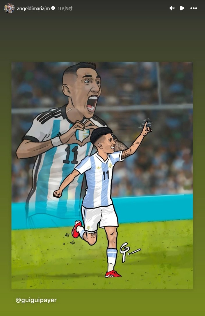 他的表現(xiàn)得到了前輩的認(rèn)可,迪馬利亞轉(zhuǎn)發(fā)了一張兩人同框的漫畫海報(bào),預(yù)示著阿根廷11號的傳承。
