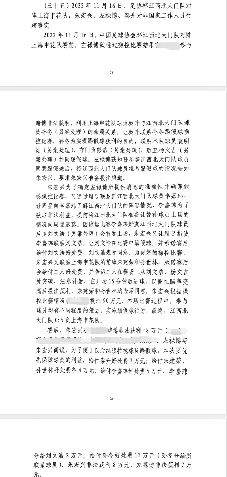 朱宏興為了確定左祿博所提供消息的準確性并確保能夠操控比賽,又通過周星聯(lián)系到江西北大門隊球員李嘉瑋,讓周星向李嘉瑋了解江西北大門隊的陣容情況,李嘉瑋為了獲取非法利益,提前將江西北大門隊準備讓替補球員上場的情況向周星透露。因該場比賽李嘉瑋好友江西北大門隊球員后衛(wèi)劉文浩(另案處理)會首發(fā)上場,朱宏興又讓周星指使李嘉瑋聯(lián)系劉文浩,讓劉文浩在比賽中踢假球,并承諾賽后給付劉文浩好處費,劉文浩表示同意。為更好的操控比賽,朱宏興又聯(lián)系上海申花隊的前鋒朱建榮和孫世林,承諾賽后會給付二人好處費,并告訴二人在賽場上從劉文浩、楊文吉處突破,注意補射,在開場15分鐘后進球,以便在賠率變高后投注獲利,朱建榮和孫世林均表示同意。朱宏興根據(jù)操控比賽情況在投注90萬元。本場比賽過程中,參與球員均有不同程度的策劃、實施踢假球行為。最終,江西北大門隊0-5負上海申花隊。