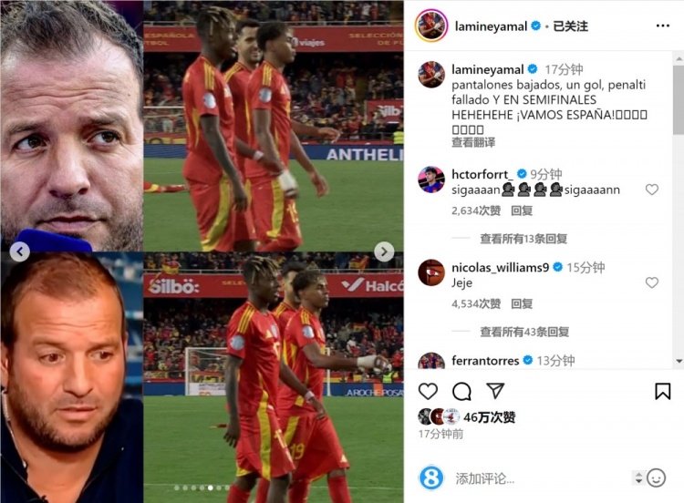 晉級(jí)之后,亞馬爾在社交媒體上曬出自己的賽場(chǎng)照,以及范德法特的照片,并寫道:“球褲低穿、打進(jìn)一球、點(diǎn)球失手、晉級(jí)半決賽。哈哈哈,西班牙加油!”