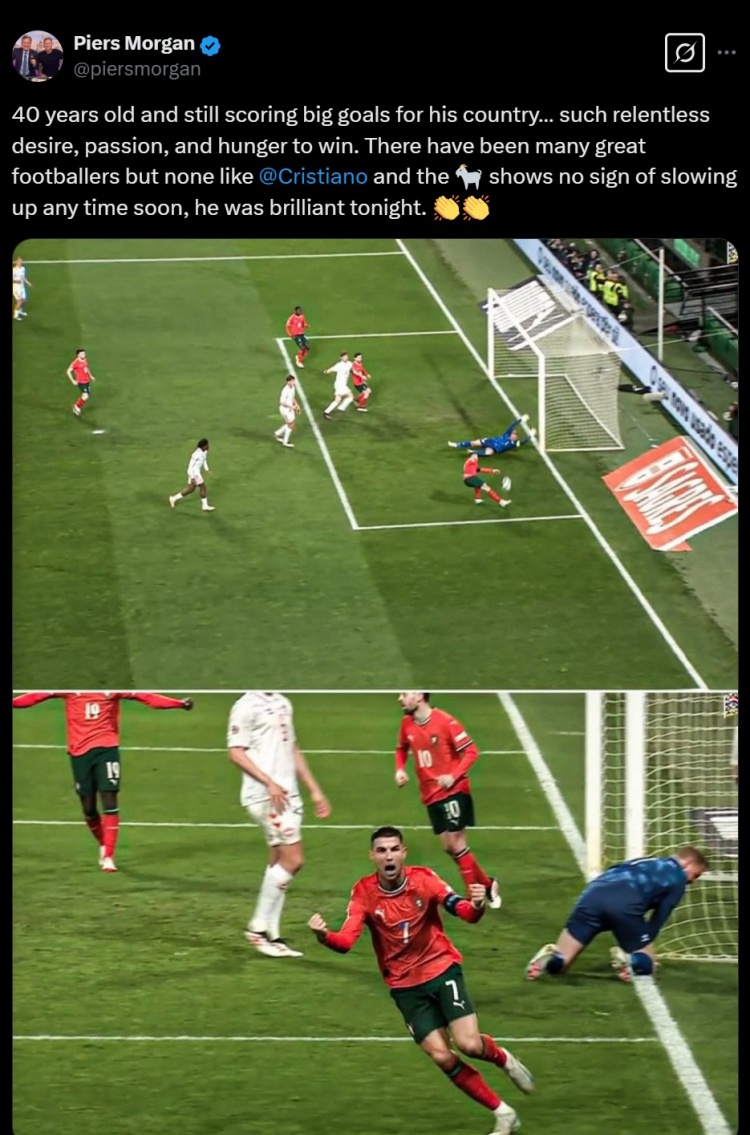 摩根寫道:40歲了,依然能為國(guó)家隊(duì)取得關(guān)鍵進(jìn)球……他彰顯了如此不懈的渴望、激情和對(duì)勝利的饑餓感。偉大的球員有很多,但沒(méi)有一個(gè)能像C羅一樣。并且,GOAT(歷史最佳球員)沒(méi)有任何跡象表明他會(huì)很快放慢腳步,他今晚表現(xiàn)得非常出色。????