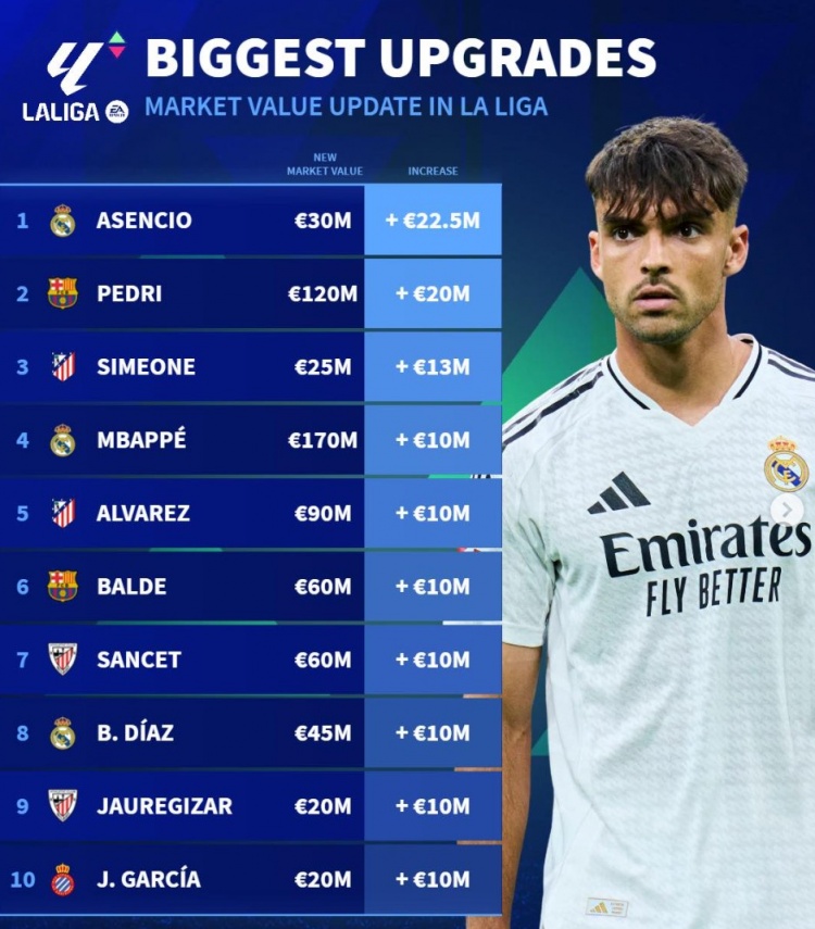 3月24日訊 《轉(zhuǎn)會(huì)市場(chǎng)》統(tǒng)計(jì)了西甲球員身價(jià)更新后的升值最多情況,勞爾-阿森西奧力壓佩德里居首。