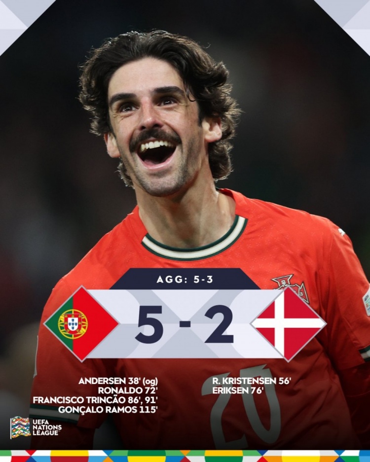 本場比賽丹麥直至常規(guī)時間第85分鐘仍保持總比分領(lǐng)先,但特林康的進球?qū)⒈荣愅先爰訒r,葡萄牙隨后在加時依靠特林康和拉莫斯再入兩球鎖定勝局。