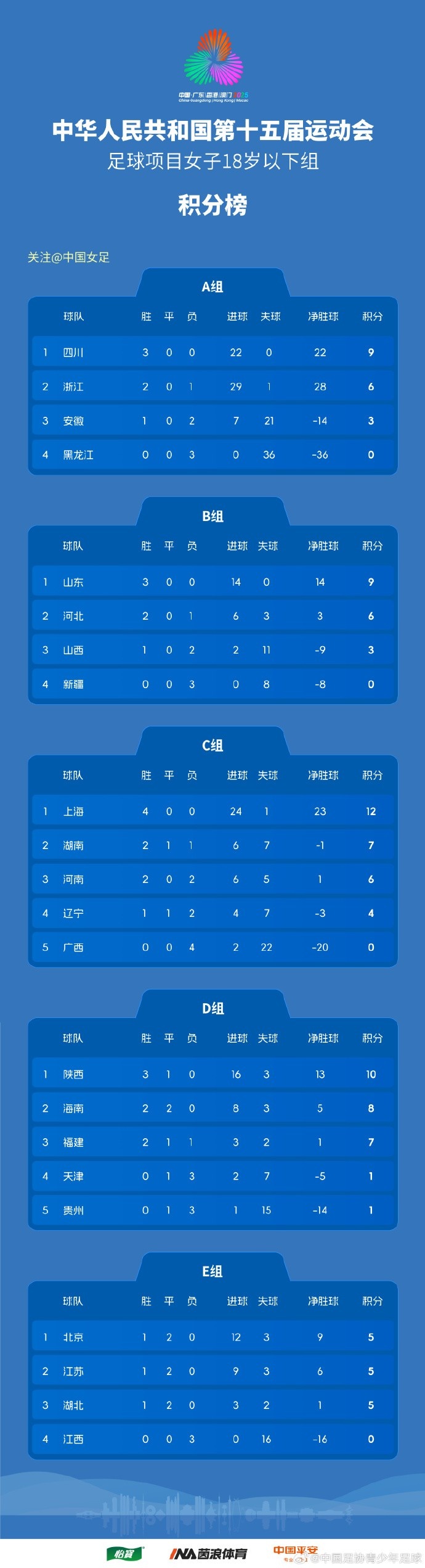 全運(yùn)會女足U18資格賽(CD組)第5輪、(ABE組)第3輪賽果+積分榜