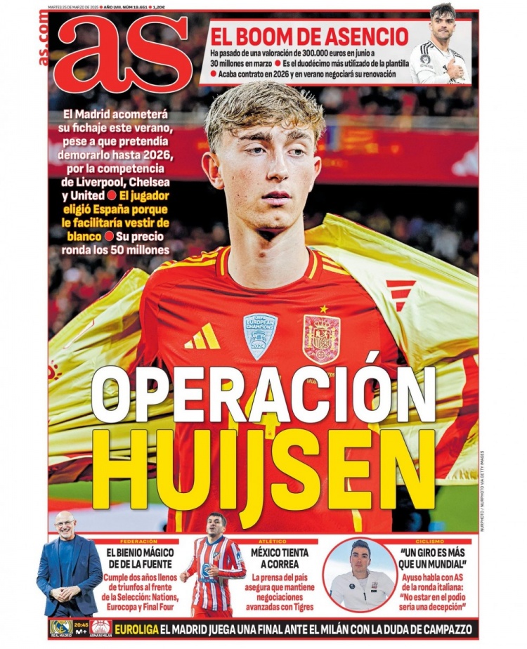 懷森成為《阿斯報》3月25日的封面人物,媒體指出,皇馬對這位19歲中衛(wèi)感興趣,盡管伯恩茅斯打算將懷森留到2026年,但考慮到面臨利物浦、切爾西和曼聯的競爭,皇馬打算今夏就采取行動簽下他。