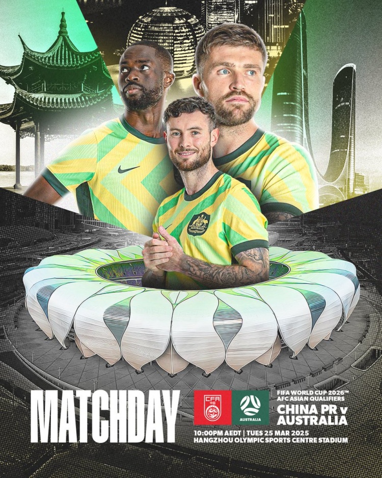 澳大利亞國(guó)家隊(duì)官推發(fā)布了本場(chǎng)比賽的海報(bào),三名后衛(wèi)杰里亞、艾登-奧尼爾和伯吉斯入鏡,本場(chǎng)比賽的體育場(chǎng)“大蓮花”位于海報(bào)下方。