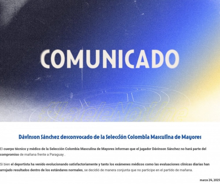 3月25日訊 哥倫比亞國家隊官方確認,達文森-桑切斯退出本期國家隊集訓(xùn)。