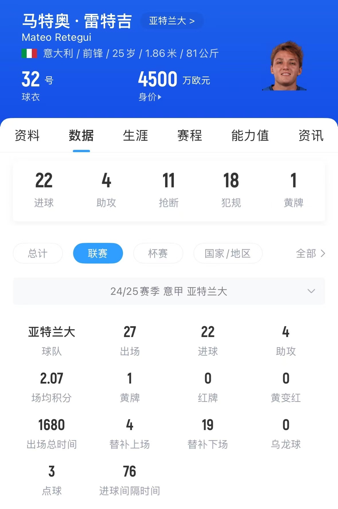 本賽季25歲的雷特吉表現(xiàn)出色,27輪意甲打進(jìn)22球,斷層領(lǐng)跑聯(lián)賽射手榜,領(lǐng)先第二的小基恩7球,并幫助亞特蘭大排在意甲第三。