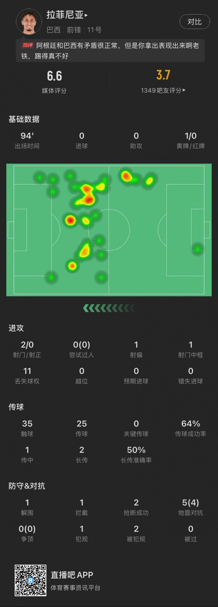 3月26日訊 在剛剛結(jié)束的世界杯預(yù)選賽中,巴西1-4不敵阿根廷。本場(chǎng)比賽,拉菲尼亞發(fā)揮欠佳,僅獲評(píng)6.6分,賽前他曾放狠話要“狠狠干翻阿根廷”。