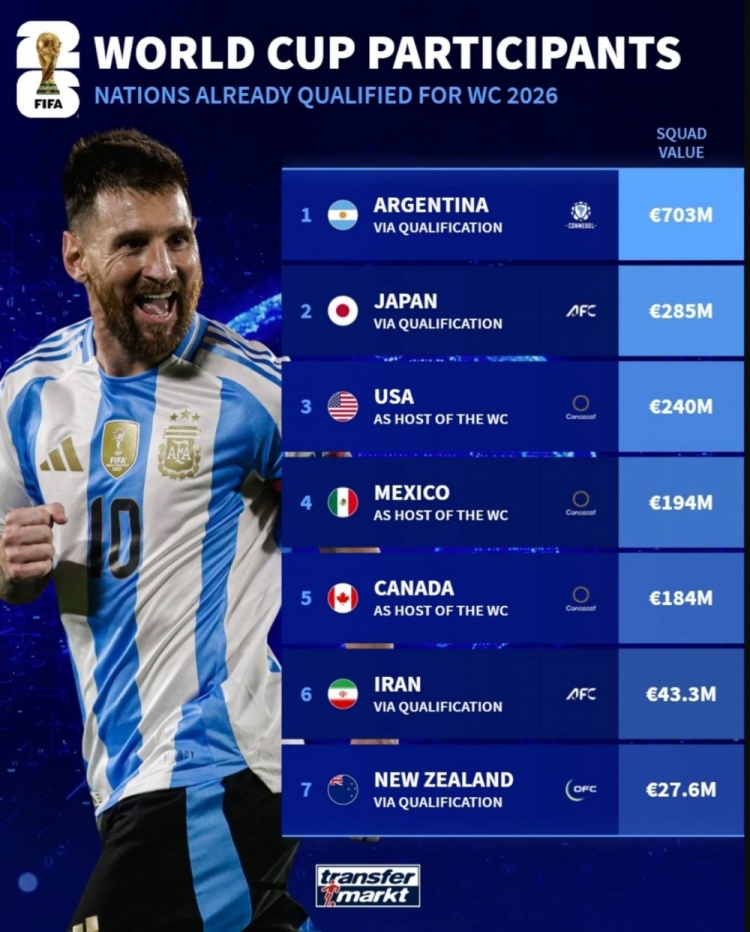 已獲世界杯資格球隊身價榜:阿根廷7.03億歐居首,日本、美國前三