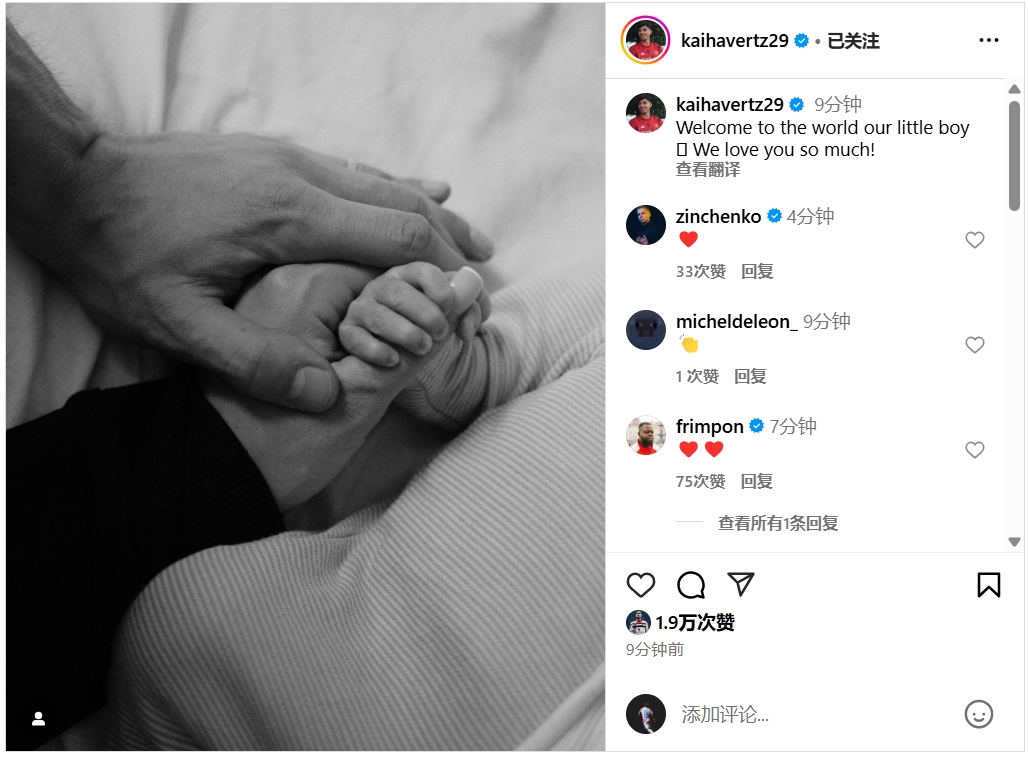 03月26日訊 哈弗茨在社交媒體曬出照片,宣布兒子的出生。