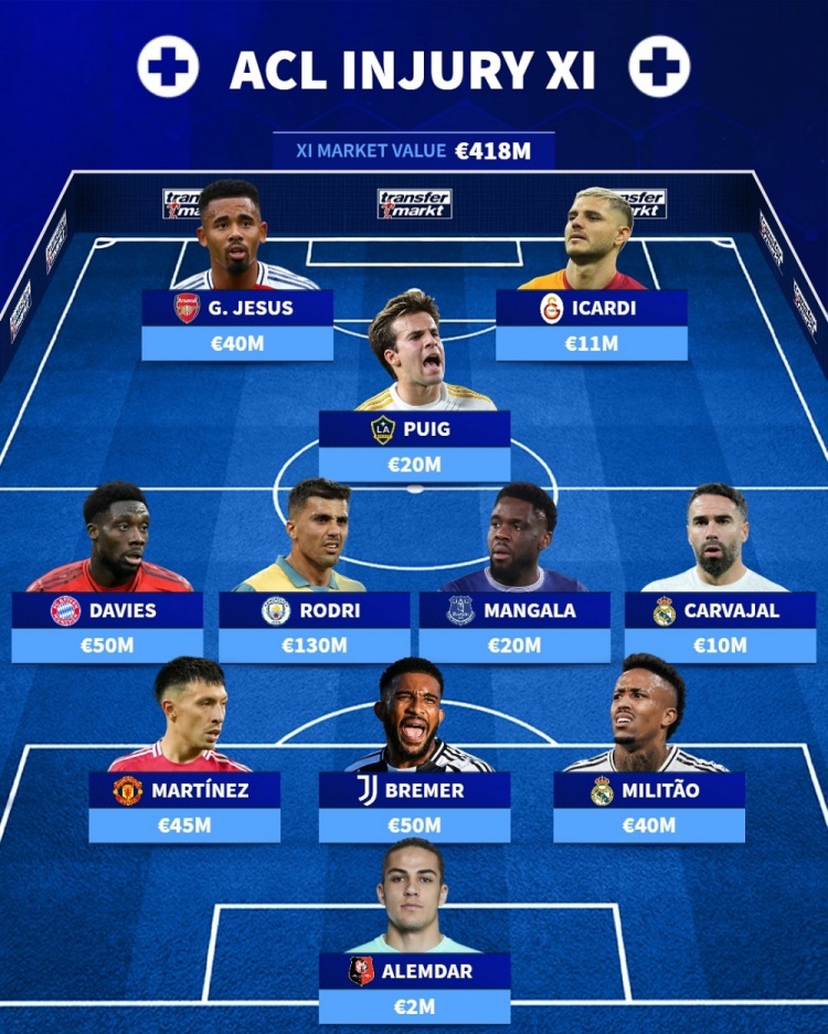 3月27日訊 德國(guó)轉(zhuǎn)會(huì)市場(chǎng)排出了本賽季十字韌帶受傷球員陣容,羅德里、戴維斯、米利唐、卡瓦哈爾、熱蘇斯、伊卡爾迪在列。