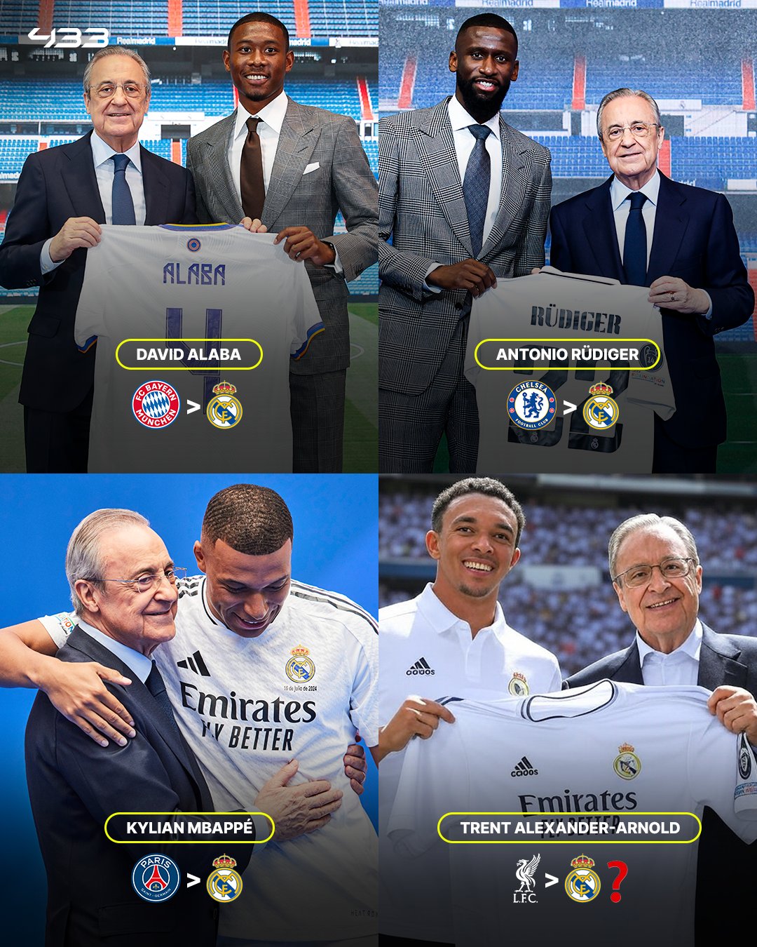 2022年,29歲的呂迪格從切爾西自由身加盟,皇馬同樣未向切爾西支付任何轉(zhuǎn)會費(球員身價4000萬歐),呂迪格與皇馬簽約4年,年薪約800萬歐,,他的合同與阿拉巴一樣將于2026年到期。