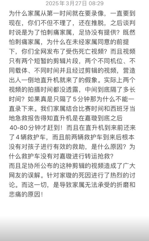 為什么家屬從第一時間就在要錄像,一直要到現(xiàn)在,你們不但不理了,還在推脫,之后談判時說是為了怕刺痛家屬,足協(xié)沒有提供?既然怕刺痛家屬,為什么在未經(jīng)家屬同意的前提下,你們?nèi)W(wǎng)發(fā)布了受傷死亡視頻?而且視頻只有兩個短暫的剪輯片段,兩個不同機位、不同載體、不同時間并且經(jīng)過剪輯的視頻,營造出人一倒地直升機就來了的假象。實際上兩個視頻的拍攝時間都沒透露,中間到底隔了多長時間?如果真是只隔了5分鐘那為什么不能一直錄下來。