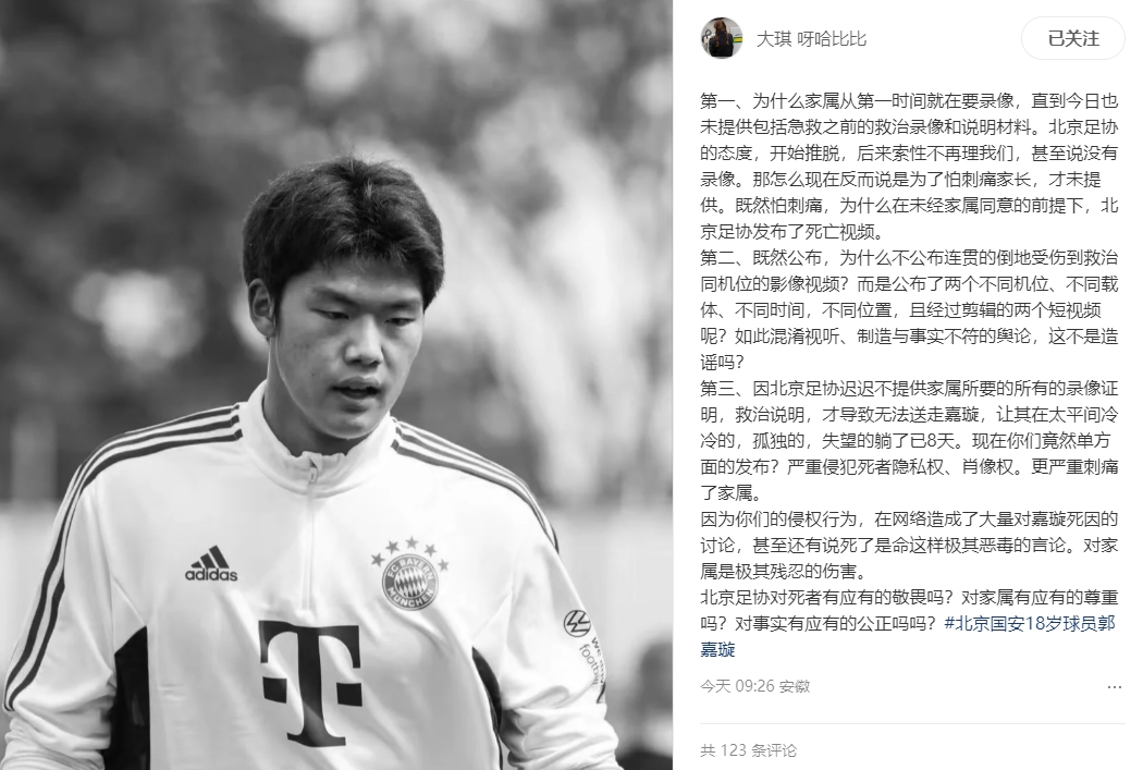 第一、為什么家屬從第一時間就在要錄像,直到今日也未提供包括急救之前的救治錄像和說明材料。北京足協(xié)的態(tài)度,開始推脫,后來索性不再理我們,甚至說沒有錄像。那怎么現(xiàn)在反而說是為了怕刺痛家長,才未提供。既然怕刺痛,為什么在未經(jīng)家屬同意的前提下,北京足協(xié)發(fā)布了死亡視頻。