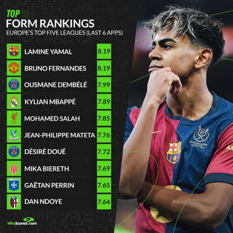 3月28日訊 國家隊(duì)比賽周已經(jīng)結(jié)束,whoscored統(tǒng)計(jì)了五大聯(lián)賽此前6輪的場均評分情況,亞馬爾和B費(fèi)并列居首。