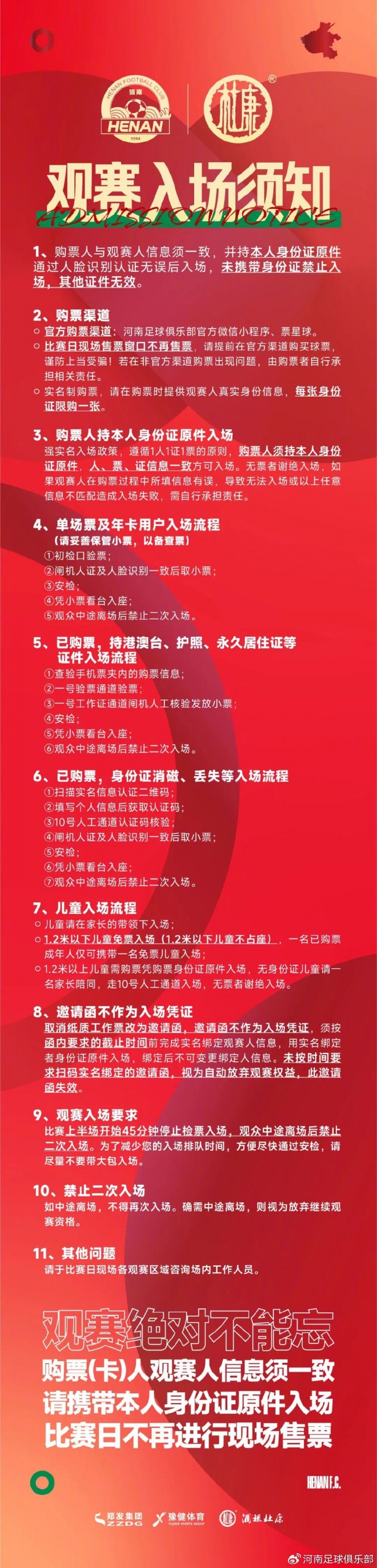 1、應(yīng)河南賽區(qū)公安及反恐部門要求,球迷未攜帶身份證禁止入場(chǎng),其他證件無效。