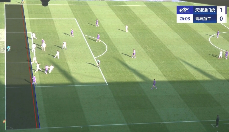 比賽第23分鐘,巴頓禁區(qū)內(nèi)抽射破門,隨后VAR介入,判罰阿代米在接應王秋明傳球時越位在先,進球無效。場上比分仍為津門虎1-0海牛。