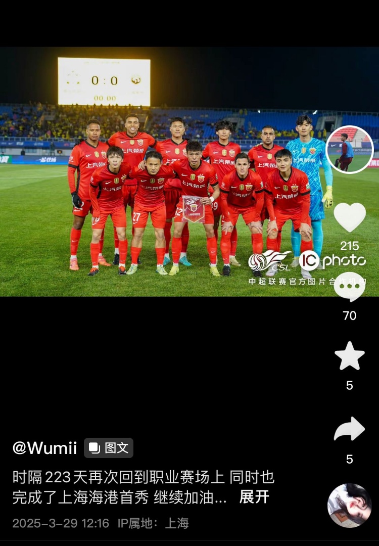 吾米提江在個(gè)人短視頻賬號(hào)中說(shuō)道:“時(shí)隔223天再次回到職業(yè)賽場(chǎng)上,同時(shí)也完成了上海海港首秀。繼續(xù)加油吧,小伙子”,隨后陶強(qiáng)龍留言稱吾米提江為“頂級(jí)切赫”,吾米提江也回稱“頂級(jí)寶哥”。