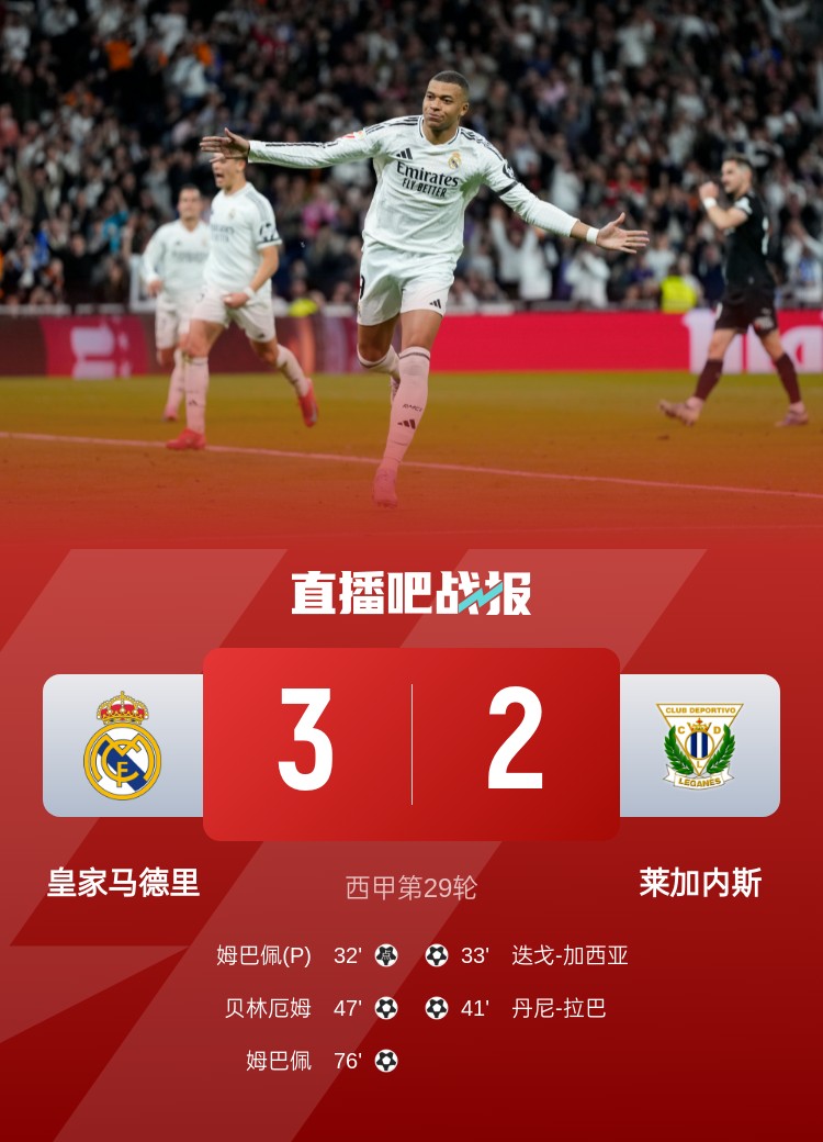 西甲第29輪,皇馬3-2萊加內(nèi)斯,聯(lián)賽三連勝。上半場,居勒爾造點(diǎn),姆巴佩點(diǎn)射,迭戈-加西亞迅速扳平,丹尼-拉巴破門反超;下半場,貝林厄姆建功,姆巴佩再下一城。