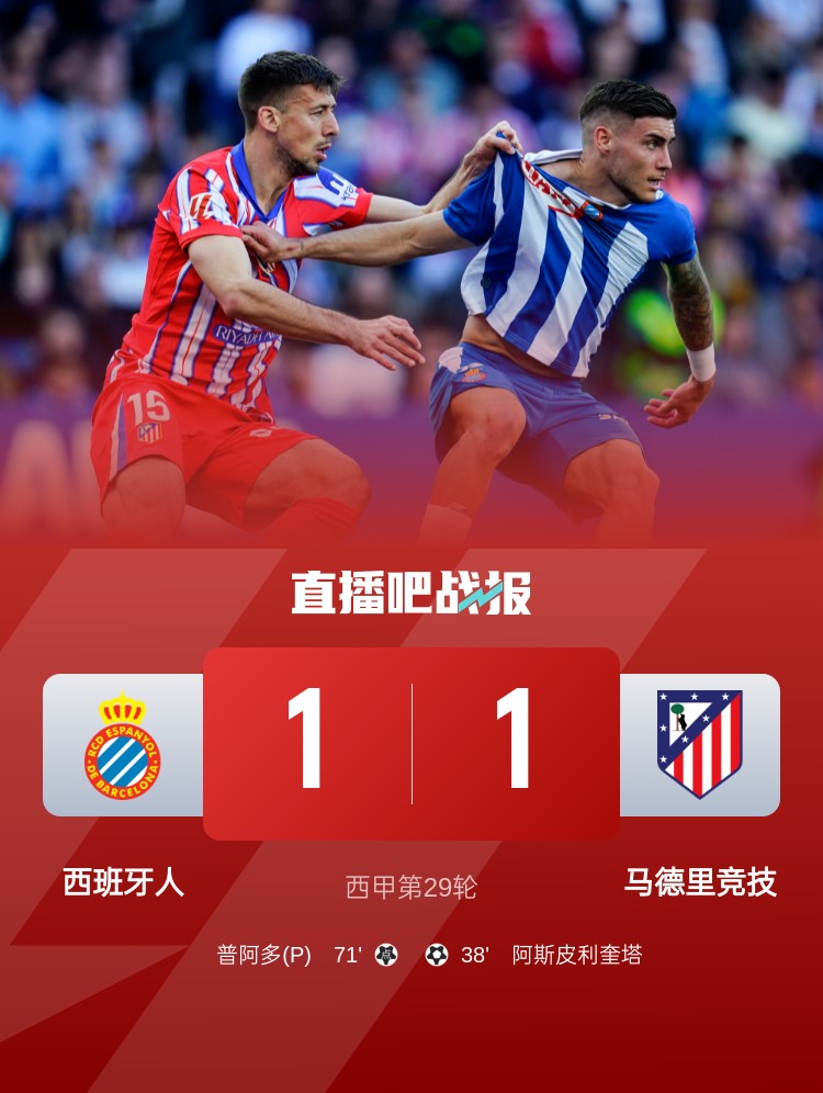 西甲第29輪,馬競客場1-1西班牙人。上半場,勒諾爾芒傷退,阿斯皮利奎塔凌空無解世界波;下半場,朗格萊魯莽拉人送點(diǎn),普阿多點(diǎn)射扳平。
