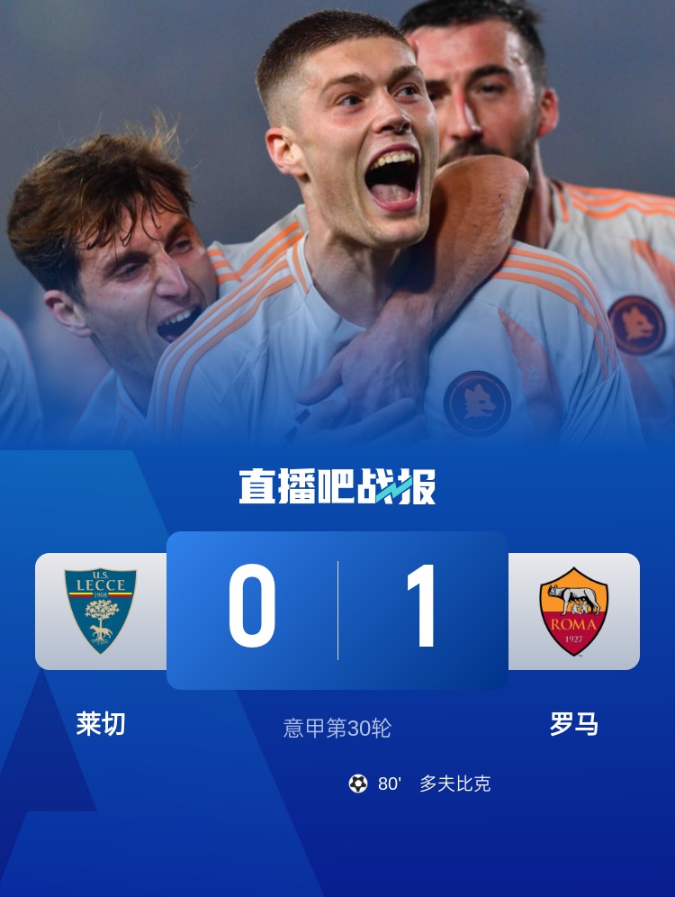 意甲第30輪,萊切0-1羅馬。上半場,科內(nèi)錯(cuò)失良機(jī);下半場,小曼奇尼進(jìn)球被吹,多夫比克低射制勝。