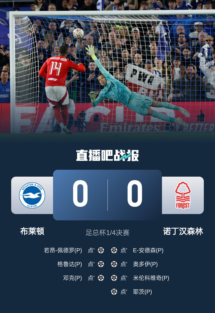 足總杯1/4決賽,布萊頓點(diǎn)球大戰(zhàn)3-4諾丁漢森林遭淘汰。上半場,埃斯圖皮尼遠(yuǎn)射造險(xiǎn);下半場,主裁判判罰三笘薰禁區(qū)內(nèi)犯規(guī)但VAR取消點(diǎn)球;加時(shí)賽,佩德羅破門但助攻的埃斯圖皮尼安越位;點(diǎn)球大戰(zhàn),辛謝爾伍德、戈麥斯主罰被撲出,威廉姆斯爆射打飛。