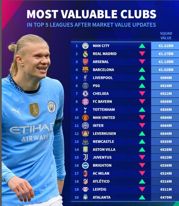轉(zhuǎn)會市場列五大聯(lián)賽俱樂部最新身價(jià)榜:歐元