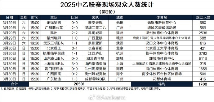 3月31日訊 據(jù)德轉(zhuǎn)中國(guó)區(qū)管理員朱藝統(tǒng)計(jì),中乙第2輪場(chǎng)均現(xiàn)場(chǎng)觀眾1708人,四場(chǎng)比賽觀眾超千人,其中泰山B隊(duì)主場(chǎng)8113人最多。