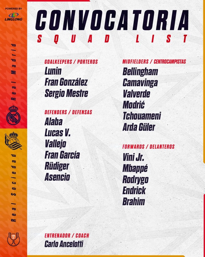 3月31日訊 北京時(shí)間4月2日周三凌晨3點(diǎn)30分,皇家馬德里將在國王杯半決賽次回合主場(chǎng)對(duì)陣皇家社會(huì),首回合皇馬1-0取勝,今天皇馬公布了次回合比賽日名單,具體如下: