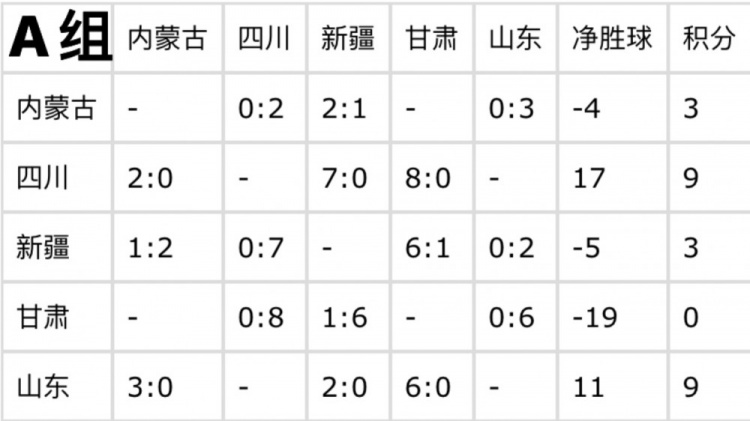 目前,四川和山東同積9分,憑借出色的表現(xiàn)已提前鎖定出線資格。在凈勝球方面,四川以17個凈勝球領先,山東凈勝球為11個。內(nèi)蒙古和新疆均積3分,甘肅積0分已確定無緣出線。最后一輪比賽,雖無直接影響出線的關鍵對決,但各隊仍會為榮譽而戰(zhàn),力求以更好的成績結(jié)束資格賽階段。