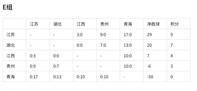 江蘇隊以9分和29個凈勝球的絕對優(yōu)勢提前出線。湖北積7分、凈勝球20個,出線形勢大好;江西積4分、凈勝球7個,仍有出線機會;貴州積3分、凈勝球 -6,青海積0分、凈勝球 -50已出局。最后一輪比賽,各隊之間的競爭將決定剩余出線名額的歸屬,比賽結(jié)果充滿懸念。