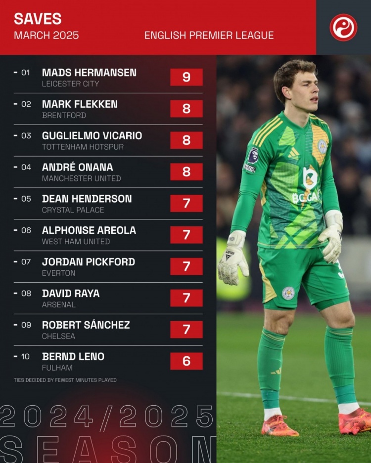 英超3月?lián)渚却螖?shù)排名:赫爾曼森9次居首,奧納納8次&拉亞7次