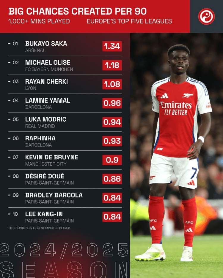 4月1日訊 Squawka統(tǒng)計(jì)了本賽季五大聯(lián)賽球員每90分鐘創(chuàng)造重大機(jī)會(huì)的次數(shù),薩卡1.34次居首,奧利塞1.18次第二。