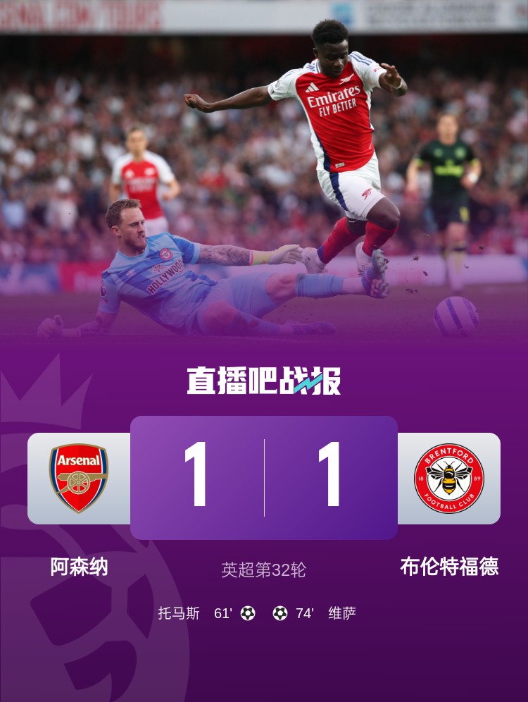 英超第32輪,阿森納1-1布倫特福德,托馬斯進(jìn)球,賴(lài)斯助攻。