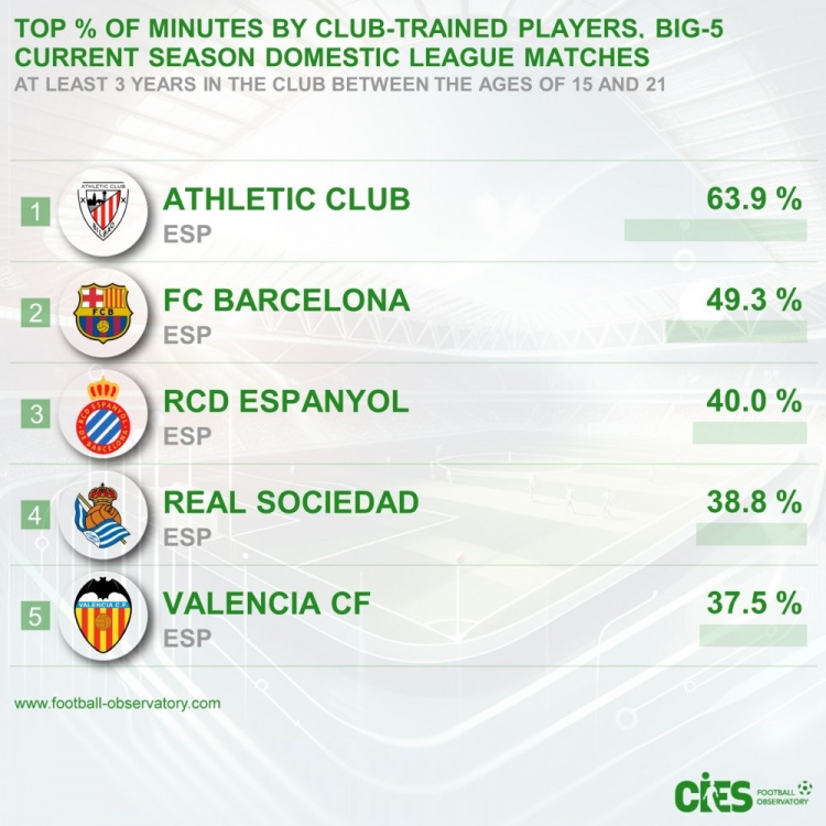 2月22日訊 瑞士足球天文臺(tái)統(tǒng)計(jì)了本賽季五大聯(lián)賽球隊(duì)自家青訓(xùn)球員的出場時(shí)間占全隊(duì)的比例,并列出榜單,畢爾巴鄂63.9%居首,巴薩49.3%第二,前5名皆為西甲球隊(duì)。