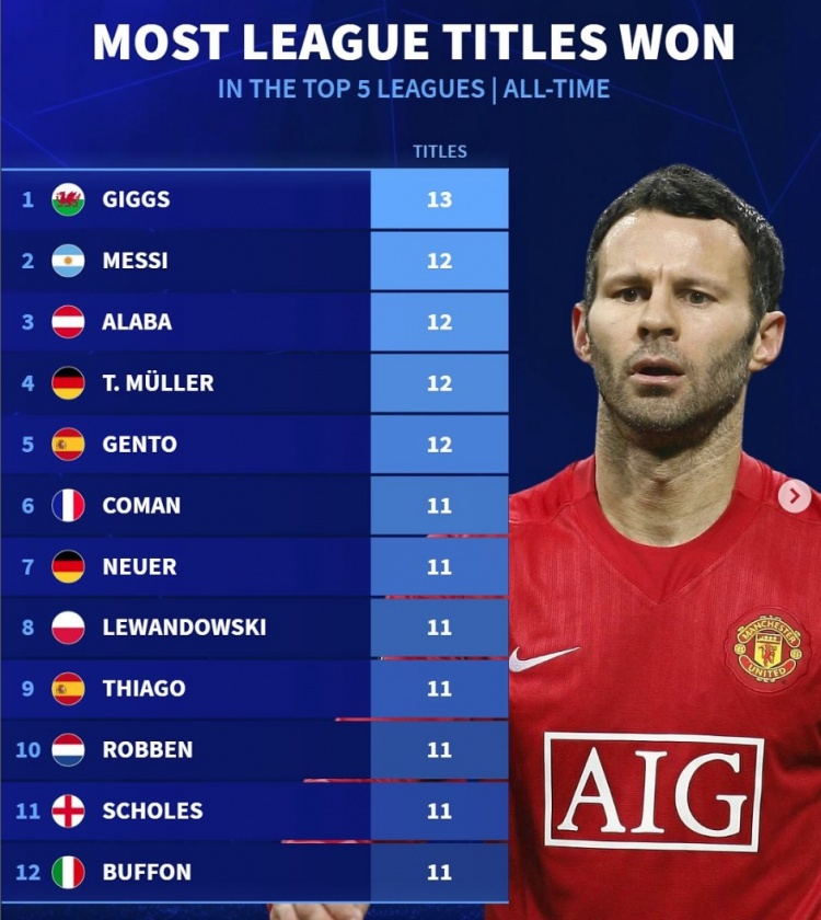 五大聯(lián)賽歷史奪冠榜:吉格斯13冠居首,梅西、阿拉巴、穆勒12冠