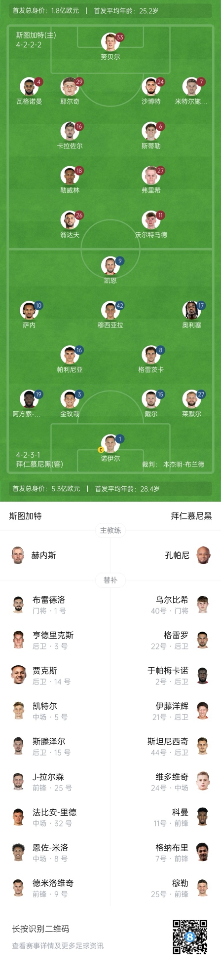 拜仁替補(bǔ):40-烏爾比格、2-于帕梅卡諾、21-伊藤洋輝、22-格雷羅、44-斯坦尼西奇、24-維多維奇、7-格納布里、11-科曼、25-穆勒
