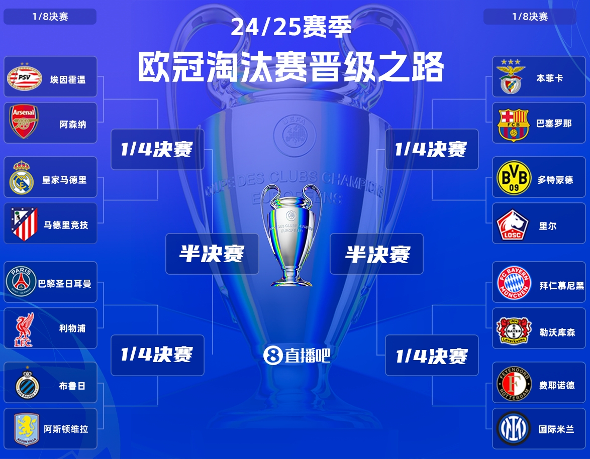 2月22日訊 24/25賽季歐冠淘汰賽賽程出爐,1/8決賽首回合將在3月5日凌晨開(kāi)戰(zhàn)。