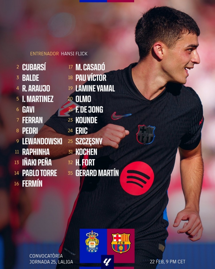 2月22日訊 北京時間明天凌晨4:00,巴薩將在西甲25輪中客戰(zhàn)拉斯帕爾馬斯。賽前,巴薩公布了將出戰(zhàn)這場比賽的大名單。其中,萊萬領(lǐng)銜,奧爾莫、亞馬爾在列,費爾明解禁復(fù)出,法蒂缺席。