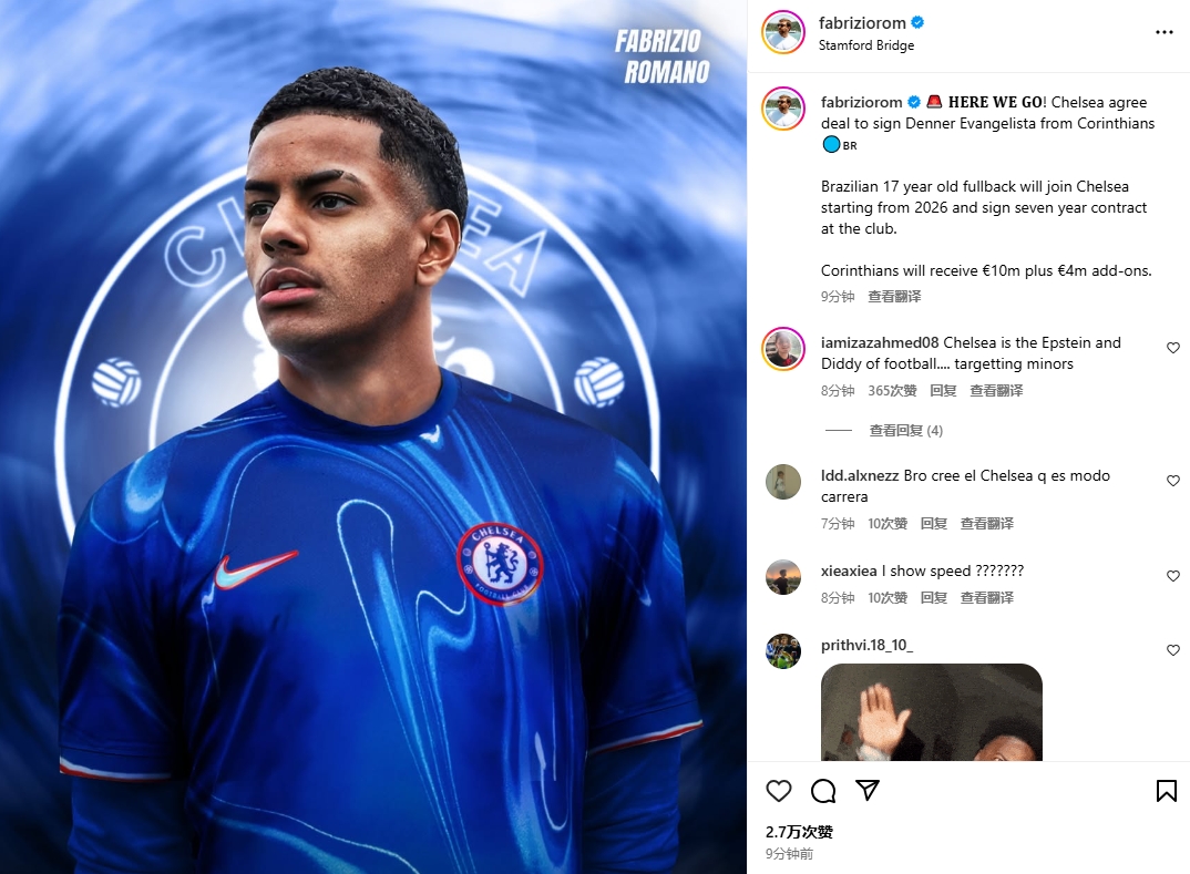 17歲的科林蒂安小將登納2008年2月25日出生,他還沒有為一線隊效力過。羅馬諾表示,登納將在年滿18歲后也即是2026年才加盟切爾西,簽約時長為7年??屏值侔卜矫鎸⑹盏娇們r1400萬歐的轉(zhuǎn)會費(fèi)(1000萬固定+400萬附加)。