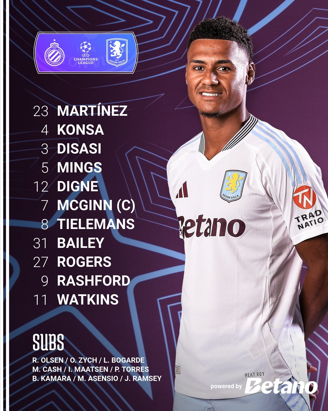 拉師傅出戰(zhàn)歐冠淘汰賽!維拉vs布魯日:拉什福德、沃特金斯先發(fā)