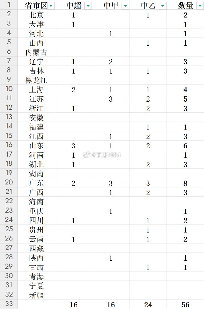 山東省擁有6支職業(yè)球隊(duì)(山東泰山、青島西海岸、青島海牛、青島紅獅、山東泰山B隊(duì)、泰安天貺)排名第二,江蘇省5支(南通支云、蘇州東吳、南京城市、無(wú)錫吳鉤、海門珂締緣)排在第三位。內(nèi)蒙古、黑龍江、安徽、湖南、海南、西藏、青海、寧夏、新疆沒(méi)有職業(yè)聯(lián)賽球隊(duì)。