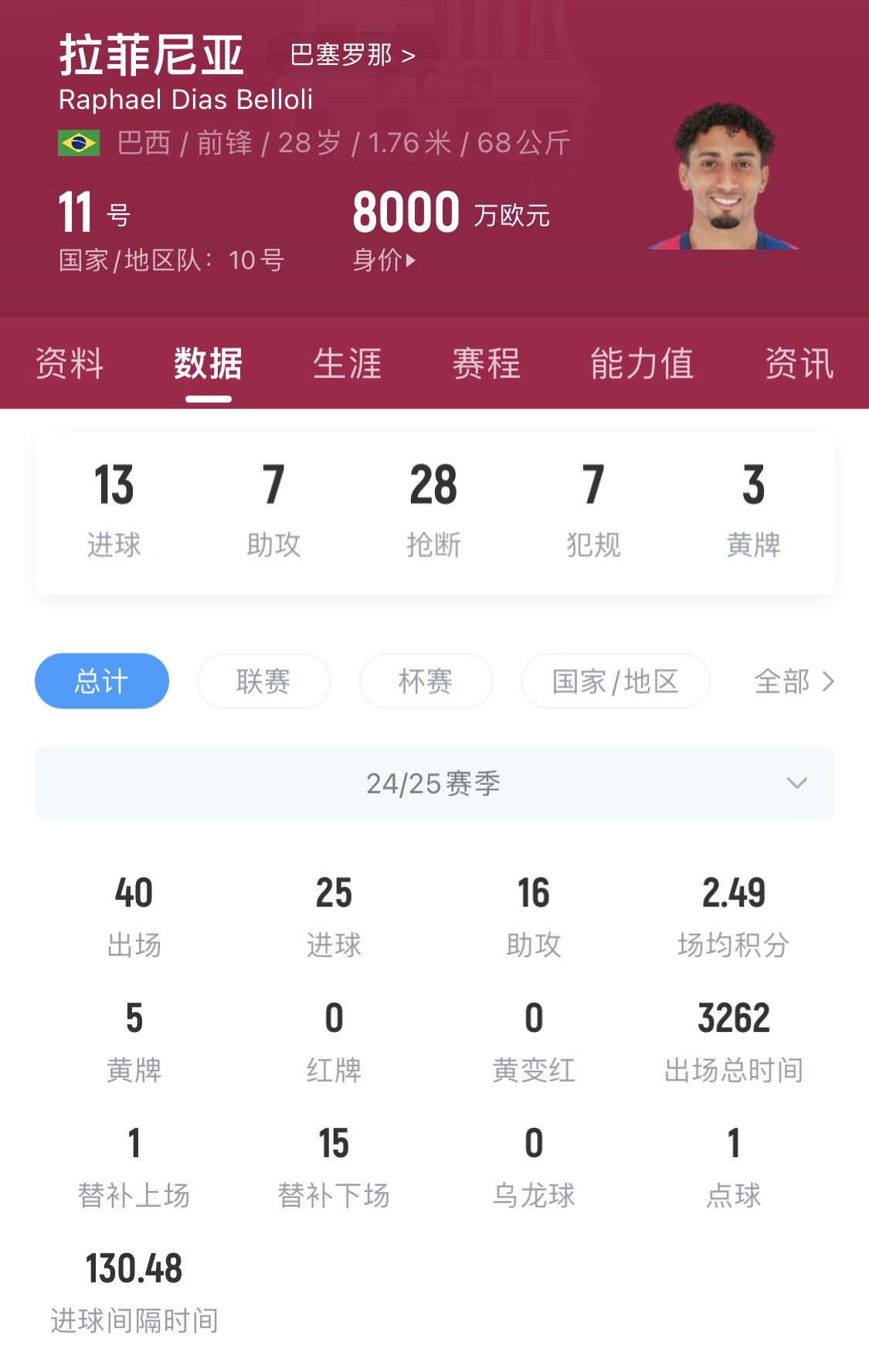 實打?qū)嵉?000萬!拉菲尼亞25球16助,金球獎賠率第3高于維尼修斯