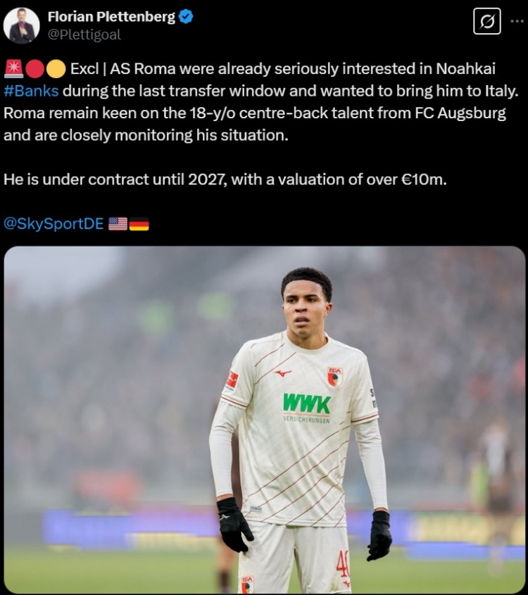 報(bào)道稱羅馬在上一個(gè)轉(zhuǎn)會(huì)窗就已經(jīng)認(rèn)真考慮引進(jìn)班克斯,球隊(duì)現(xiàn)在還一直關(guān)注著球員的情況。班克斯目前與奧格斯堡的合同將在2027年到期,預(yù)計(jì)的轉(zhuǎn)會(huì)身價(jià)超過1000萬歐。