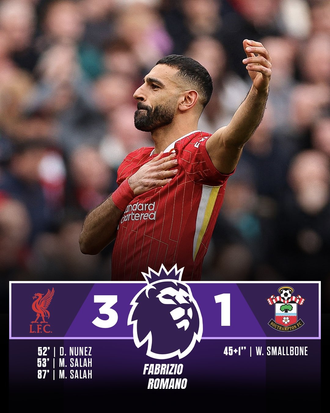 薩拉赫聯(lián)賽對陣南安普頓打進10球,追平伊恩-拉什保持的進球紀錄