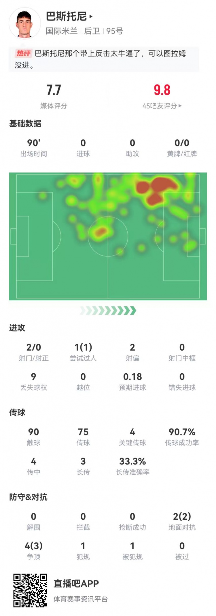 巴斯托尼客串左翼衛(wèi)數(shù)據(jù):4關(guān)鍵傳球+2射門(mén) 6對(duì)抗5成功 獲評(píng)7.7分