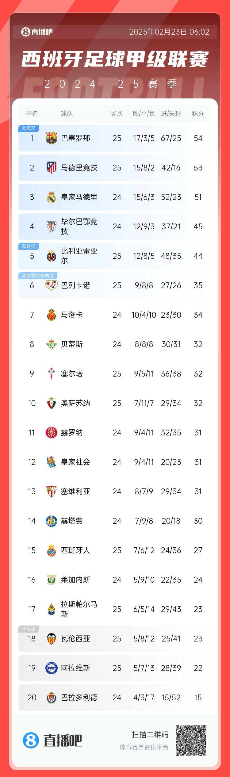保住榜首!西甲積分榜:巴薩領(lǐng)先馬競(jìng)1分,領(lǐng)先未賽的皇馬3分