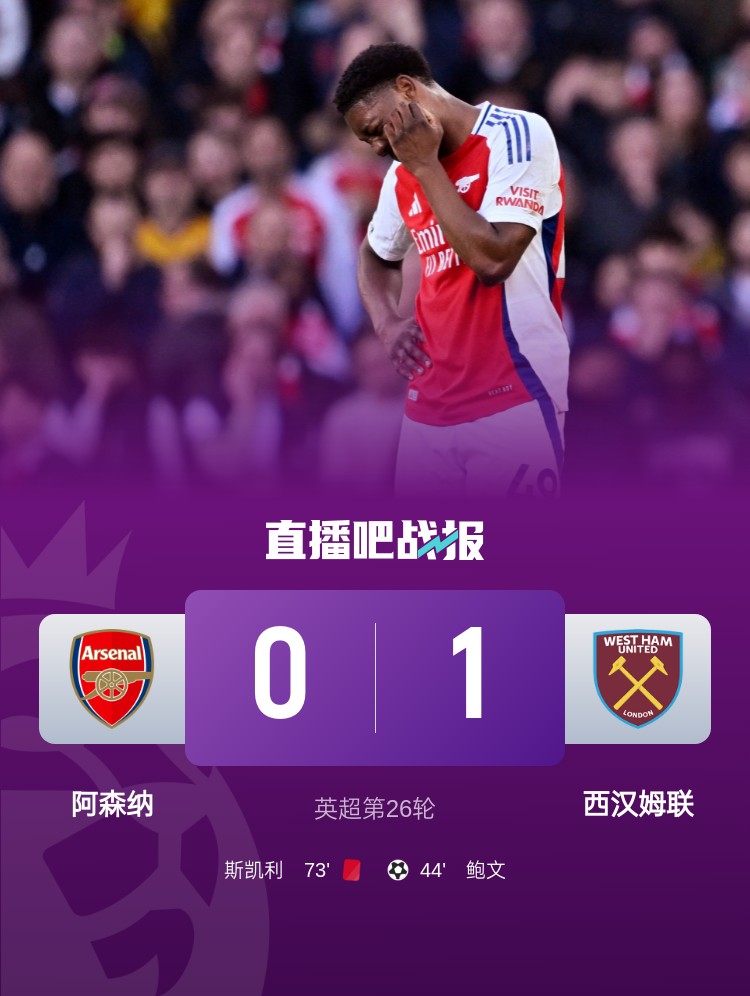 英超聯(lián)賽第26輪,阿森納主場(chǎng)0-1不敵西漢姆,鮑文進(jìn)球,斯凱利紅牌。
