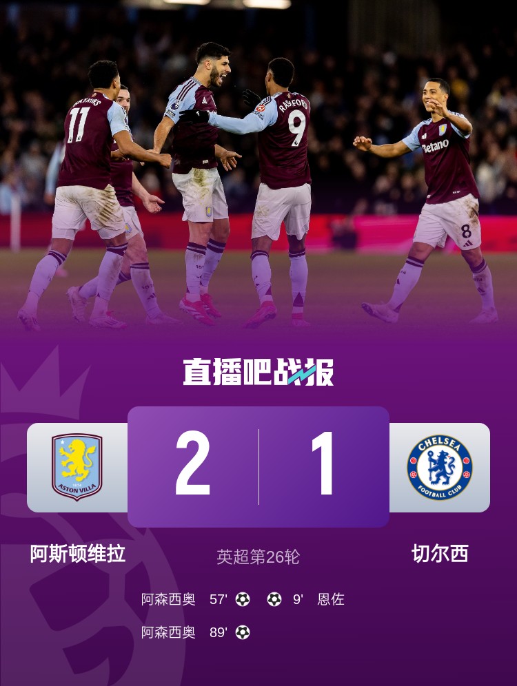 英超聯(lián)賽第26輪,切爾西客場(chǎng)1-2遭遇阿斯頓維拉逆轉(zhuǎn)絕殺,阿森西奧梅開二度,拉什福德2次助攻。